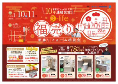 2026年1月10日(土)・11日(日) e-lifeショールームにて、福売り 新春リフォーム相談会を開催いたします。ショールームにて展示していた商品を、各限定1台、破格プライスで販売いたします。